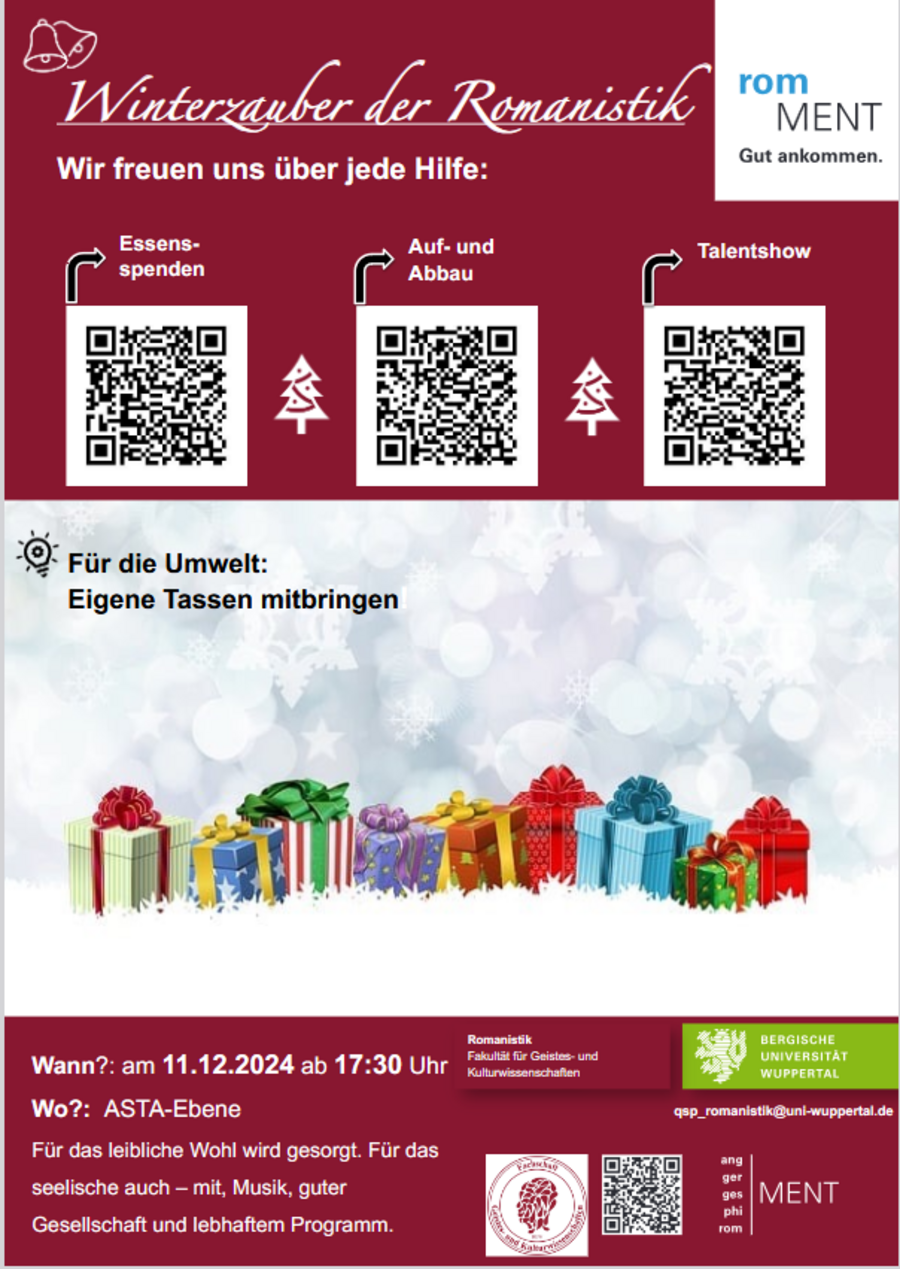 Zusammen mit dem QSP-Team und der Fachschaft laden wir euch herzlich zum Winterfest der Romanistik am Mittwoch, den 11. Dezember ab 17:30 Uhr auf der Asta-Ebene ein. Kommt vorbei und helft gerne mit!